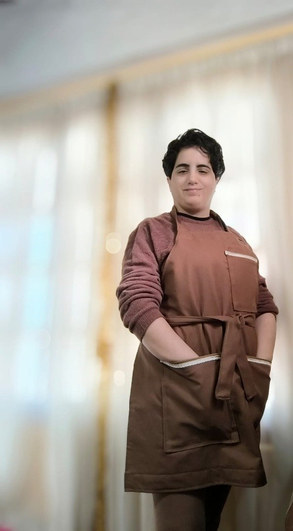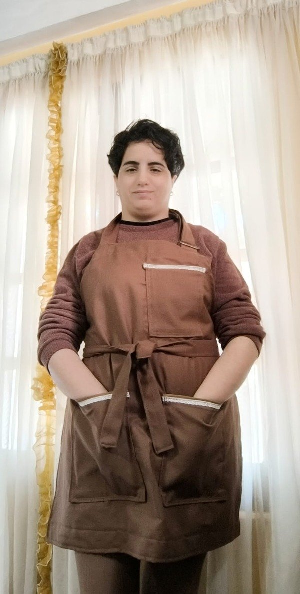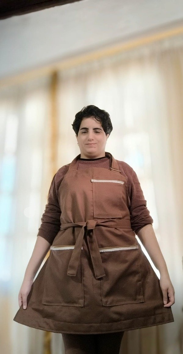 El delantal está confeccionado en gabardina color chocolate, un tono cálido y elegante que transmite sobriedad y armonía.