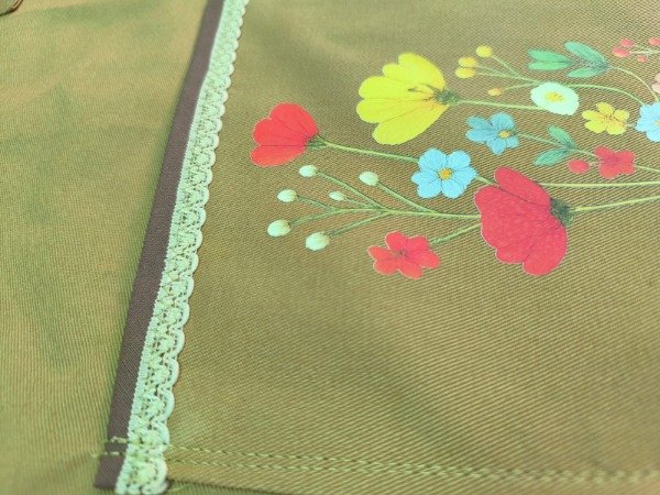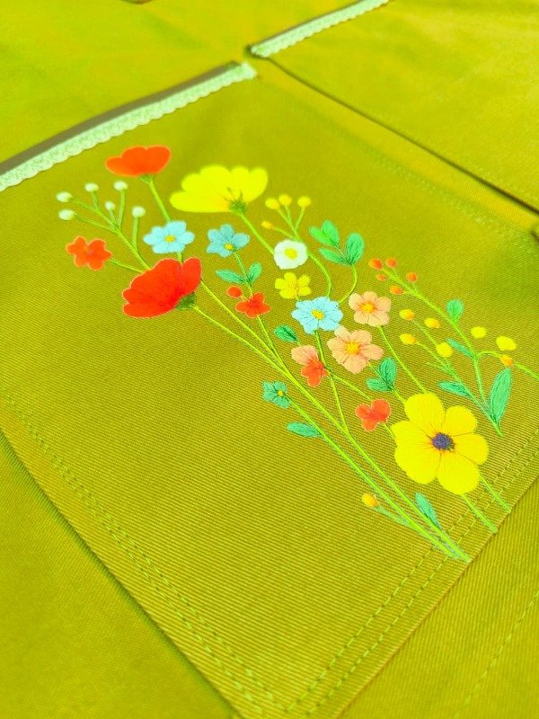 Cada bolsillo está decorado con delicadas estampas florales en tonos vibrantes, que evocan la primavera y aportan un toque alegre y natural.