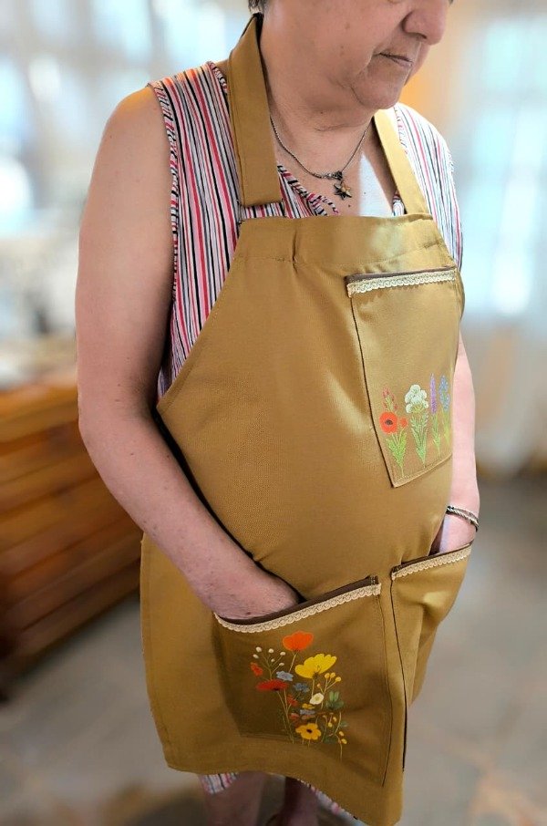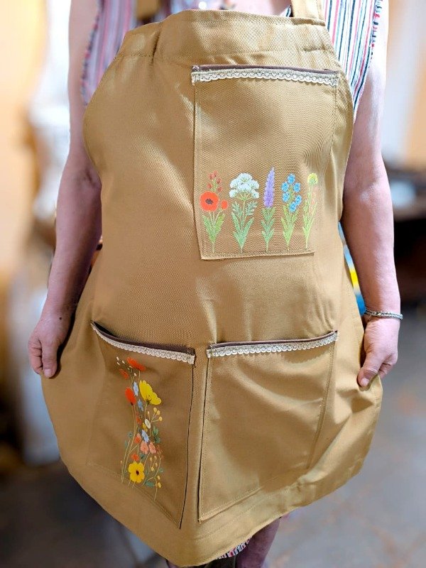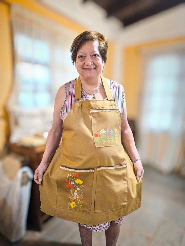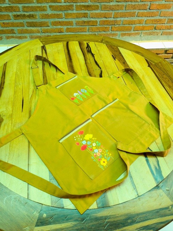 El delantal confeccionado en gabardina color madera, un material resistente y de textura suave que aporta calidez y durabilidad.